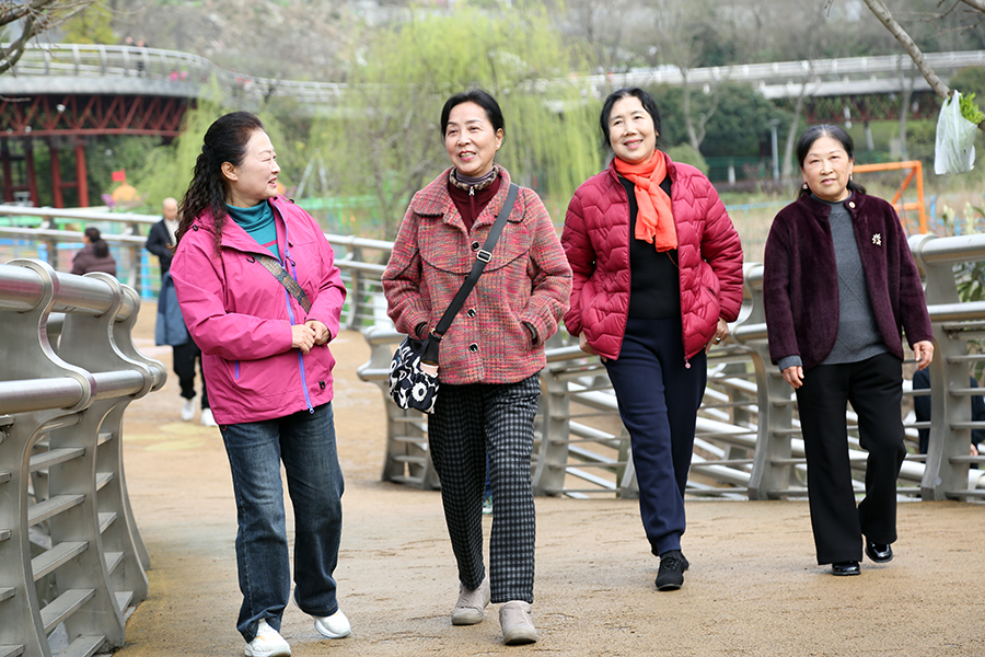 活动中,退休女职工们精神饱满、结伴而行,沿着“健康步道”(天桥)一路前行,在春意盎然的忠庄河畔,用健步行走的方式庆祝自己的节日。大家三五成群,时而驻足留影,时而谈笑风生,充分展现了乐观豁达、积极向上的精神风貌。